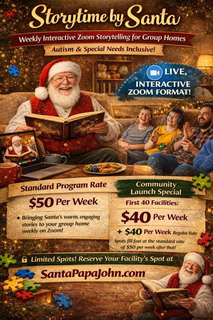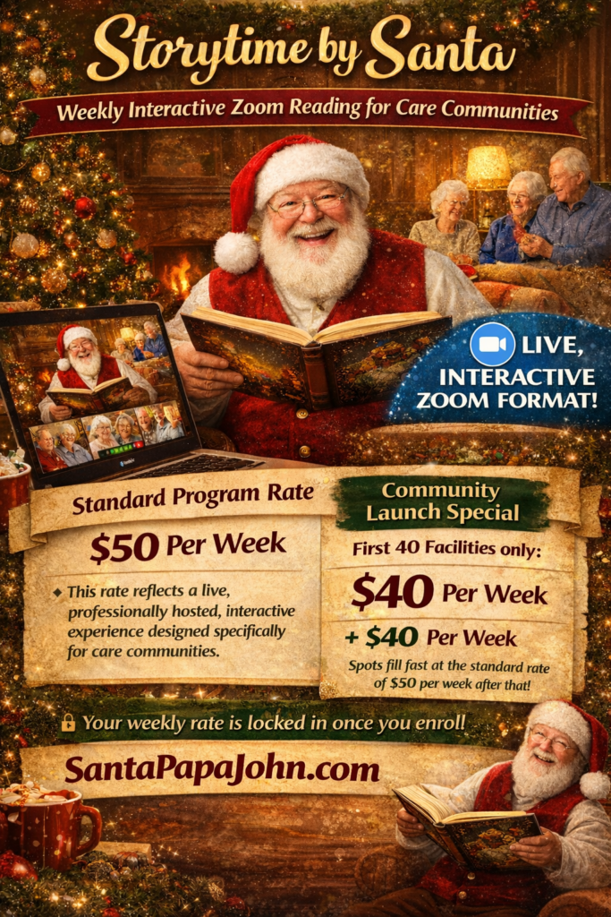Storytime with Santa Papa John is a simple, joyful program created to bring connection, laughter, and positive memories to seniors and individuals living in group homes.